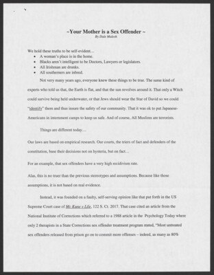 ~Your Mother is a Sex Offender ~ By Dale Malesh We hold these truths to be self--evident. .. . A woman's place is in the home. . Blacks aren't intelligent to be Doctors, Lawyers or...