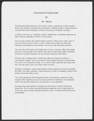COLD DAYS IN PURGATORY BY B.C. Murray The divergent distractions that exists inside a prison compound are often enough to hoard away feelings of hopelessness and despair. Nothing though is cogent enough to overcome the...