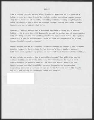 ANXIETY Like a leaking cistern, anxiety,slowly bleeds all semblance of life from one'sA A being. As soon as a rare detente is reached, another anguishing tempest appears .atop life's mountains of Volatile, tormenting emotions pressing...