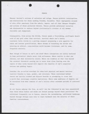 FENCES Fences: Society's artisan of salvation and refuge. Fences prohibit interruptions and distractions for those seeking freedom, fecundity. Their impregnable strands of wire offer sanctuary from the unholy, impure, and all that impugns thoughts and...
