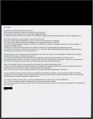 Confusion Would life be worth living without confusion? What purpose would then require our rising from bed each day? Or maneuvering for legions of hours along life's jagged pathways? If content, then what would be...