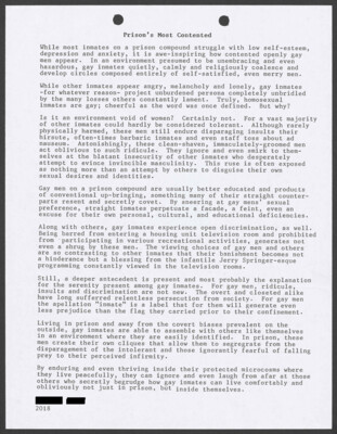 Prison's Most Contented While most inmates on a prison compound struggle with low self-esteem, depression and anxiety, it is awe-inspiring how contented openly gay men appear. In an environment presumed to be unembracing and even...