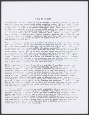 A DAY IN MY LIFE Awakened by the brilliance of 6:00AM lights, I arise, grab my toiletries and walk down the long, stale white corridor toward the restroom. First, I must wade through a bevy...