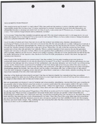 WHO BENEFITS FROM PRISON? Why would anyone want. to work in a men's prison? Who rises each morning anxious to enter a desolate world void of any responsibility greater than turning a key? Or enjoy...