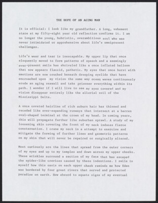 THE HOPE OF AN AGING MAN It is official: I look like my grandfather. A long, vehement stare at my fifty-eight year old reflection confirms it. I am no longer the young, hubristic, overambitious sen1...