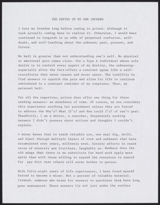 THE DEPTHS OF MY OWN INFERNO I lost my freedom long before coming to prison. Although it took actually coming here to realize it. Otherwise, I would have continued to languish in an eddy of...