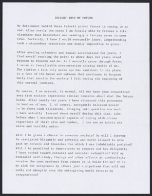 INSIGHT INTO MY FUTURE My detainment behind these federal prison fences is coming to an end. After nearly ten years I am finally able to foresee a life elsewhere that heretofore was seemingly a fantasy...