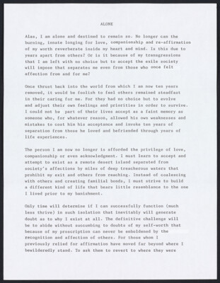 ALONE Alas, I am alone and destined to remain so. No longer can the burning, innate longing for love, companionship and re-affirmation of my worth reverberate inside my heart and mind. Is this due to...