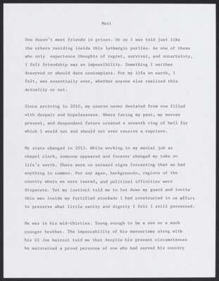 Matt One doesn't meet friends in prison. Or so I was told just like the others residing inside this lethargic purlieu. As one of those who only experience thoughts of regret, survival, and uncertainty, I...