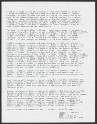 Staff as a whole create the pressure cooker environment in which we live by overcrowding, and even when they are made aware of serious conflicts by ignoring them and even setting up the conditions to...