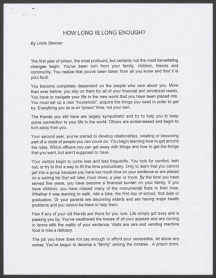 HOW LONG IS LONG ENOUGH? By Linda Stermer The first year of prison, the most profound, but certainly not the most devastating changes begin. You've been torn from your family, children, friends and community. You...