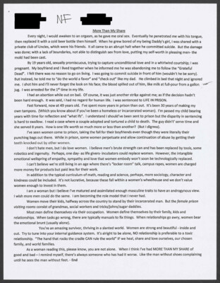 The APWA is an open access archive. We encourage use of the writings for research, course planning, and projects engaged in examination of the criminal legal system. Reproduction of essays in their entirety infringes on author copyright without their explicit consent from the writers. Please contact us if you plan to reproduce entire essays; we will do our best to put you in contact with the authors for consent, and their compensation for any project that is profit making.