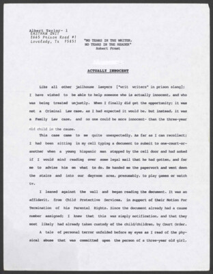 Albert Taylor- 1 Eastham Unit Lovelady, Tx 75851 "NO TEARS IN THE WRITER, NO TEARS IN THE READER" Robert Frost ACTUALLY INNOCENT Like all other jailhouse lawyers ["writ writers" in prison slang]; I have wished...