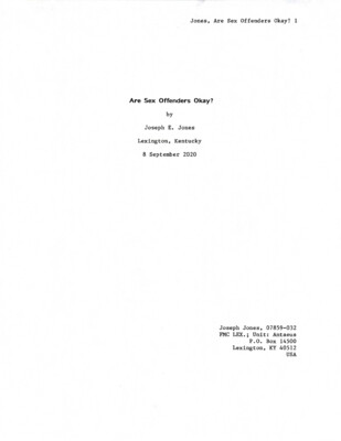 Jones, Are Sex Offenders Okay? 1 Are Sex Offenders Okay? by Joseph E. Jones Lexington, Kentucky 8 September 2020 Joseph Jones FMC Lex.; Unit: Antaeus P.O. Box 14500 Lexington, KY 40512 USA Jones, Are Sex...