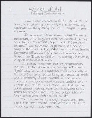 Works of Art Delusional Imprisonment 1. "Incarceration changed my life", I uttered to the immaculate soul sitting across from me. In this very audible, dull and dingy looking room sat my biggest supporter, my mom....
