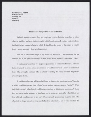 David J. Terway, F-32909 Professor CP Bird Sociology 102 24 July 14 Final Essay A Prisoner's Perspective on the Institution Before I attempt to convey howirny experience over the last nine years here in prison...
