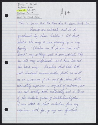 This is Gonna Hurt Me More than it's Gonna Hurt You! David J. Terway Professor Kibbe Eng 119 - Fall 2014 November 24, 2014 Parents are autocrats, not to be questioned by their children! At...