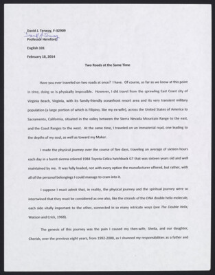 , ‘David J: T rway, F-32909 ....i/‘(2_,u,%7: -?_g,%g?g_ Profess r Herefor English 101 February 18, 2014 Two Roads at the Same Time Have you ever traveled on two roads at once? I have. Of course,...