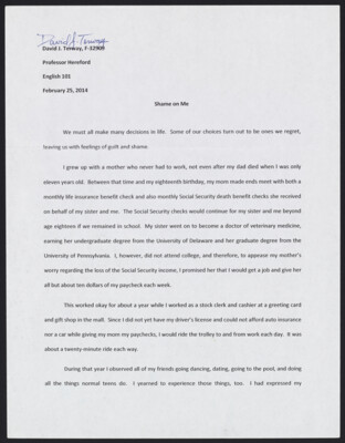 David J. Terway [ID] Professor Hereford English 101 February 25, 2014 Shame on Me We must all make many decisions in life. Some of our choices turn out to be ones we regret, leaving us...