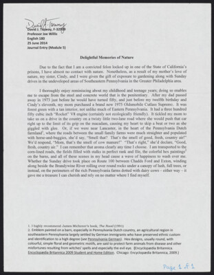 David J. Terway, [ID] Professor Joe Willis English 180 25 June 2014 Journal Entry (Module 5) Delightful Memories of Nature Due to the fact that I am a convicted felon locked up in one of...