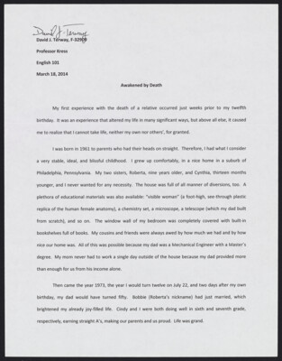 >J()T.7¢ David J. Terway, F-329 Professor Kress English 101 March 18, 2014 Awakened by Death My first experience with the death of a relative occurred just weeks prior to my twelfth birthday. It was an...