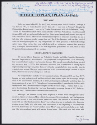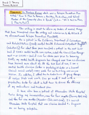 David J. Terway January 18,2020 Addendum to previous essay which was a Relapse Prevention Plan titled "How I Plan to Remain a Healthy, Productive, and Valued Member of the Community When I Parole" (a.k.a. "If...