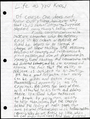 Life as you know Of course one does not know everything, however why that is, is rather intriguing. Suppose someone going through hallucinations finds communication with obscure characters who he believes exist in his releam...