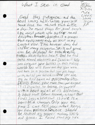 What I see in God Torres Mule Creek State Prison, CA God Has patience and the devil causes hell. Give yourself some time to absorb that. Like a day. So most things for good people...