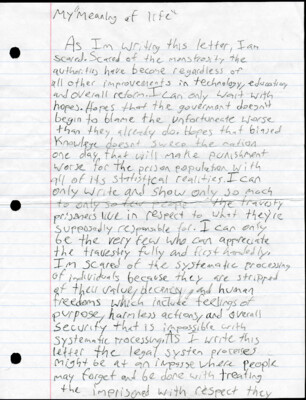 My "Meaning of Life" As Im writing this letter, I am scared. Scared of monstrosity the authorities have become regardless of all other improvements in technology, education, and overall reform. I can only wait with...