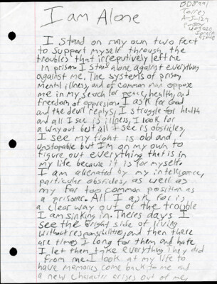 I am Alone Torres PO Box 409020 Ione Ct 95640 I stand on my own two feet to support myself through the troubles that irreputively left me in prison. I stand alone against everything against...