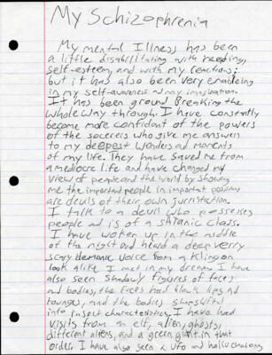 My Schizophrenia My mental illness has been a little disabilitating with reading, self-esteem, and with my reactions; but it has also been very enabling in my self-awareness and my imagination. It has been ground breaking...