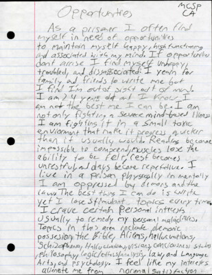 Opportunities MCSP CA As a prisoner I often find myself in need of opportunities to maintain myself happy, high-functioning, and associated with my mind. If opportunities dont arrise I find myself unhappy, troubled, and dissociated....