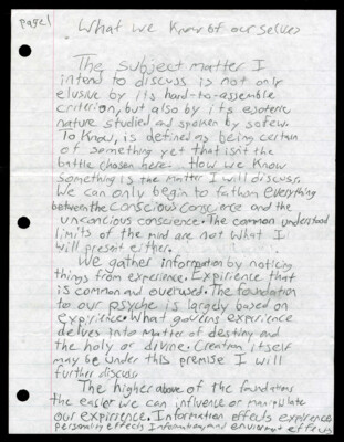 Page 1 What we know of ourselves The subject matter I intend to discuss is not only elusive by its hard-to-assemble criterion, but also by its esoteric nature studied and spoken by so few. To...