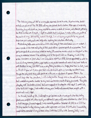 The following essay will not be an enjoyable experience for me to write. It pertains to the dental-medical care policies of the PA DOC and my own personal dental situation. After years of moderately fluctuating...