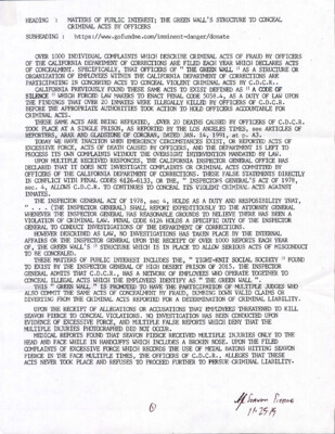 Heading: Matters of Public Interest; The Green Wall's Structure to Conceal Criminal Acts by Officers Subheading: https://www.gofundme.com/imminent-danger/donate. Over 1000 individual complaints which describe criminal acts of fraud by officers of the California Department of Corrections...