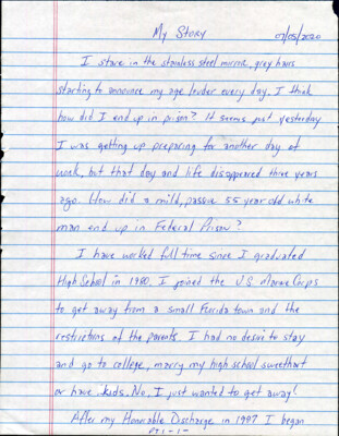 My Story 07/05/2020 I stare in the stainless steel mirror, grey hairs starting to announce my age louder every day. I think how did I end up in prison? It seems just yesterday I was...