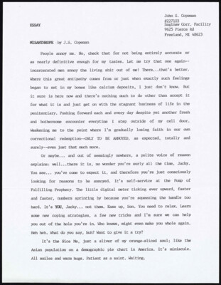 ESSAY MISANTHROPE by J .S. Copeman People annoy me. No, check that for not being entirely accurate or as nearly definitive enough for my tastes. Let me try that one again-~ incarcerated men annoy the...