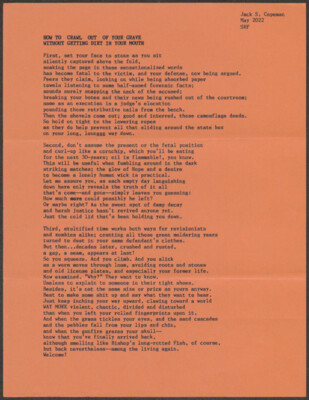 Jack S. Copeman May 2022 SRF HOW TO CRAWL OUT OF YOUR GRAVE WITHOUT GETTING DIRT IN YOUR MOUTH First, set your face to stone as you sit silently captured above the fold, soaking the...