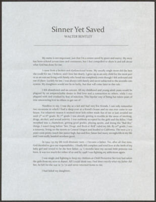 Sinner Yet Saved WALTER BENTLEY My name is not important, just that I’m a sinner saved by grace and mercy. My story has been echoed across time and continents, but I feel compelled to share...