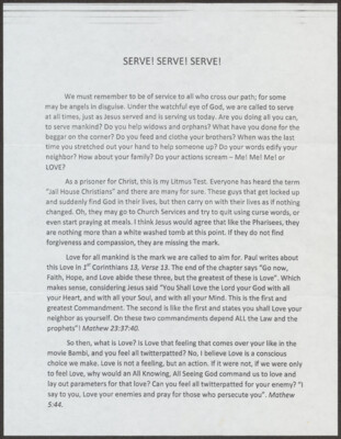 SERVE! SERVE! SERVE! We must remember to be of service to all who cross our path; for some may be angels in disguise. Under the watchful eye of God, we are called to serve at...