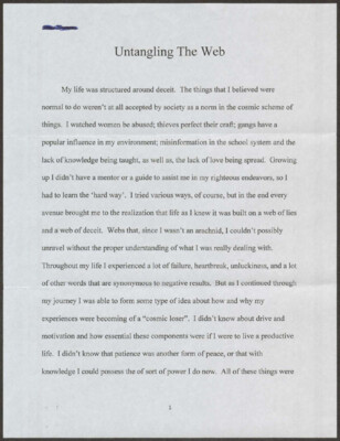 Untangling The Web My life was structured around deceit. The things that I believed were normal to do weren’t at all accepted by society as a norm in the cosmic scheme of things. I watched...