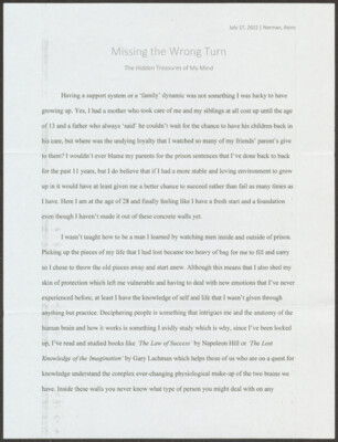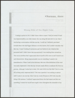 >Norman, Atere American Prison Writing Archive July 16th, 2022 Coming to prison in 2013 I didn’t know what to expect. I had just turned 18 and was impressionable as an older inmate who was doing...