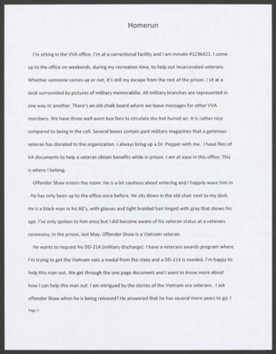 Homerun I'm sitting in the VVA office. I'm at a correctional facility and I am inmate #1236421. I come up to the office on weekends, during my recreation time, to help out incarcerated veterans. Whether...
