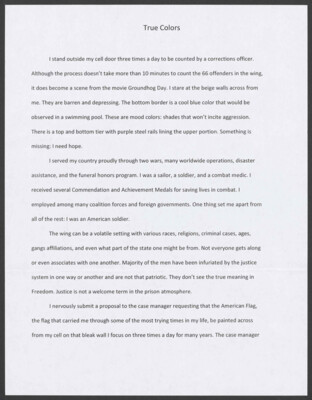 True Colors l stand outside my cell door three times a day to be counted by a corrections officer. Although the process doesn't take more than 10 minutes to count the 66 offenders in the...
