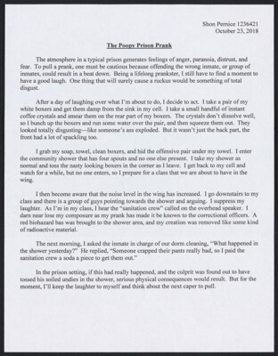 Shon Pernice 1236421 October 23, 2018 The Poopv Prison Prank The atmosphere in a typical prison generates feelings of anger, paranoia, distrust, and fear. To pull a prank, one must be cautious because offending the...