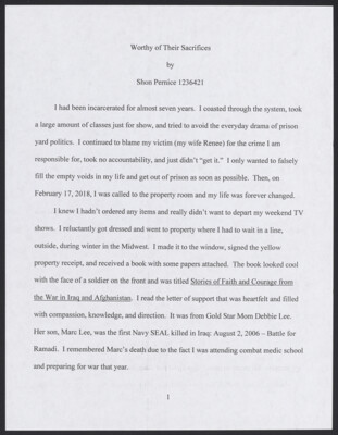 Worthy of Their Sacrifices by Shon Pemice 1236421 I had been incarcerated for almost seven years. I coasted through the system, took a large amount of classes just for show, and tried to avoid the...