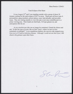 Shon Pemice 123 6421 Total Eclipse of the Heart It was August 22nd and I was standing outside with a group of about 20 inmates waiting for the total eclipse of 2017 to occur. These...