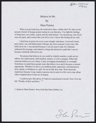 §,%M .7z:z~/ 4:45 Believe In Me By Shon Pernice When you get locked up, the metal door slams, clothes don’t fit, and you are around a bunch of strange people staring in your direction. You...