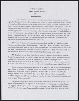 Selfish vs. Selfless When Suicide Speaks By Shon Pernice I give numerous presentations to outside guests, about life inside prison. In one topic, Psychological Prison, I discuss the process of how an inmate is informed...