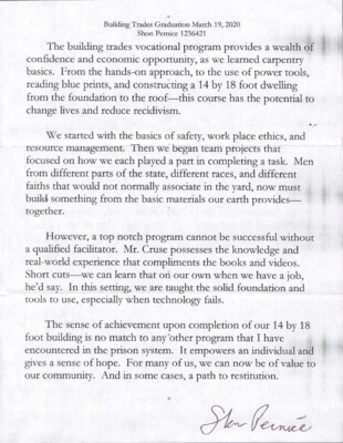 Building Trades Graduation March 19, 2020 Shon Pernice The building trades vocational program provides a wealth of confidence and economic opportunity, as we learned carpentry basics. From the hands-on approach, to the use of power...